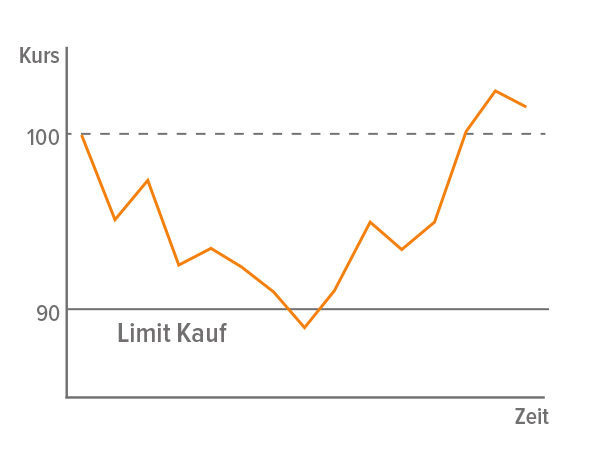 Limit Kauf Order Hier wurde das Limit bei 90 festgelegt, deutlich unter dem aktuellen Kurs von rund 100. Die Order wird ausgeführt, sobald der Kurs 90 erreicht oder unterschreitet. So wird sicher gestellt, dass der Kauf nicht teurer als geplant erfolgt. |