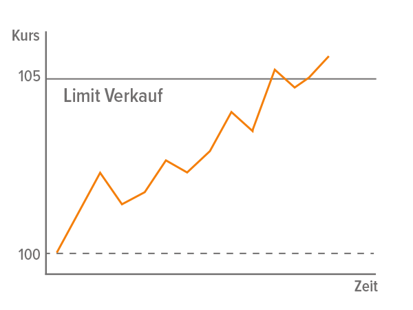 Limit Verkauf Order Hier wurde das Limit bei 105 festgelegt, also über dem aktuellen Kurs von 100. Die Ausführung erfolgt erst, wenn der Kurs 105 erreicht oder überschreitet. Damit wird sicher gestellt, dass der Verkauf mindestens zum gewünschten Preis erfolgt. |