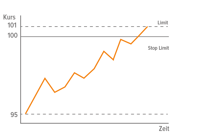 Stop-Limit Kauf Order Das Stop-Limit wird bei 100, das Limit bei 101 festgelegt. Der Kurs liegt aktuell bei 95. Die Order wird aktiv, sobald der Kurs 100 erreicht oder überschreitet. Danach erfolgt die Ausführung zum Limit von 101 oder darunter. |