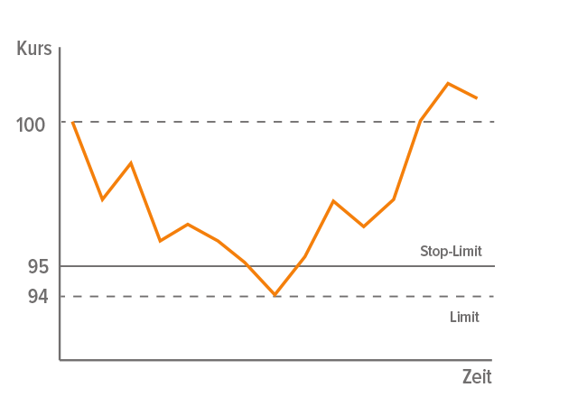 Stop-Limit Verkauf Order Das Stop-Limit wird bei 95, das Limit bei 94 festgelegt. Der Kurs liegt aktuell bei 100. Die Order wird aktiv, sobald der Kurs 95 erreicht oder unterschreitet. Danach erfolgt die Ausführung zum Limit von 94 oder höher. |