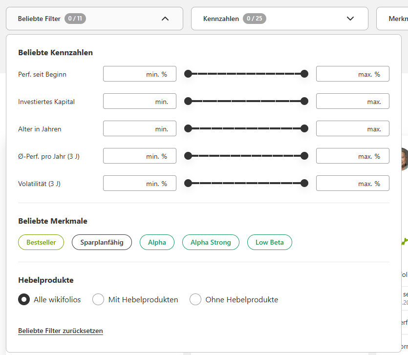 - Beliebte Filter: Hier findest du eine Vorauswahl an beliebten Kennzahlen und Merkmalen und außerdem die Möglichkeit wikifolios mit Hebelprodukten ein- und auszuschließen