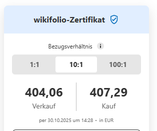 Das Bezugsverhältnis gibt an, wie der Preis (Mittelkurs) eines Stück des wikifolio-Zertifikats im Verhältnis zum wikifolio (Indexstand) selbst steht.
