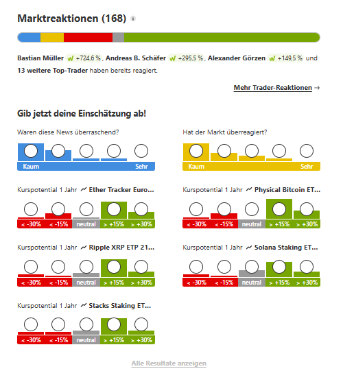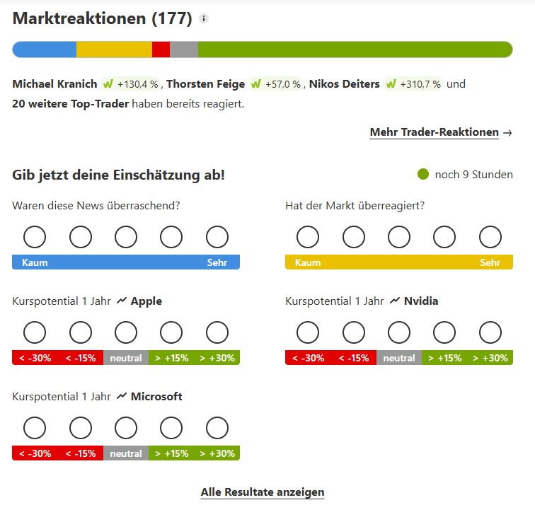 Unterhalb eines jeden News-Beitrags im News-Feed findest du (unter der Auflistung aller im Beitrag erwähnten Wertpapiere), den Abschnitt Marktreaktionen. In diesem Bereich kann die wikifolio Community ihre Expertise beisteuern und mit wenigen Klicks, Fragen zu den News beantworten.
