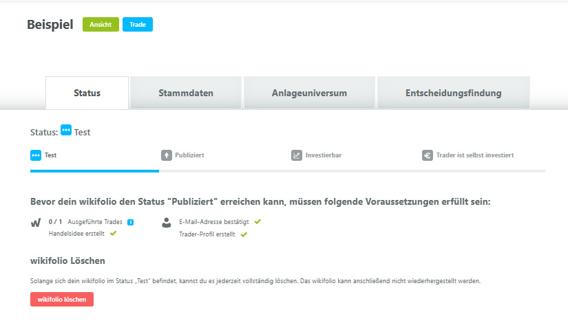 Gleich nach der Erstellung besitzt jedes wikifolio den Status „Test”. In diesem Status ist das wikifolio nur für den wikifolio Trader selbst sichtbar.