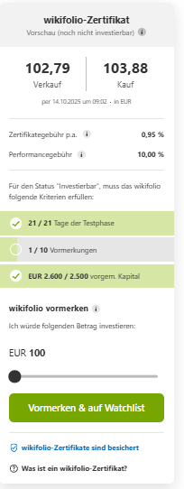 Eine Vormerkung ist wie eine Wählerstimme für ein noch nicht investierbares wikifolio. Ein wikifolio Nutzer bekundet damit unverbindlich sein Interesse in das zugehörige wikifolio-Zertifikat zu investieren, wenn das wikifolio den Status "Investierbar" erhält.