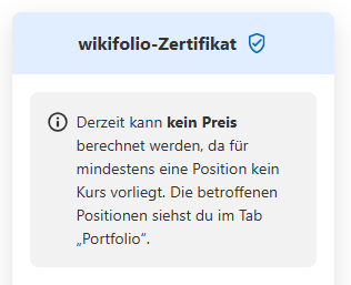 Wird anstelle der Kursdaten in der Zertifikate-Box eines wikifolios der Hinweis "Derzeit kann kein Preis berechnet werden" angezeigt, kann das zugehörige wikifolio-Zeritifkat zu diesem Zeitpunkt nicht gekauft oder verkauft werden.