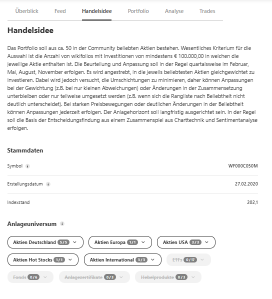 In der Handelsidee beschreibt der wikifolio Trader die grundsätzliche Investment-Strategie, die im wikifolio verfolgt werden soll. Die Handelsidee ist eine der wichtigsten Informationen für die wikifolio Community, sie ist auf der wikifolio Detailseite im Tab "Handelsidee" zu finden.
